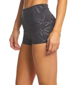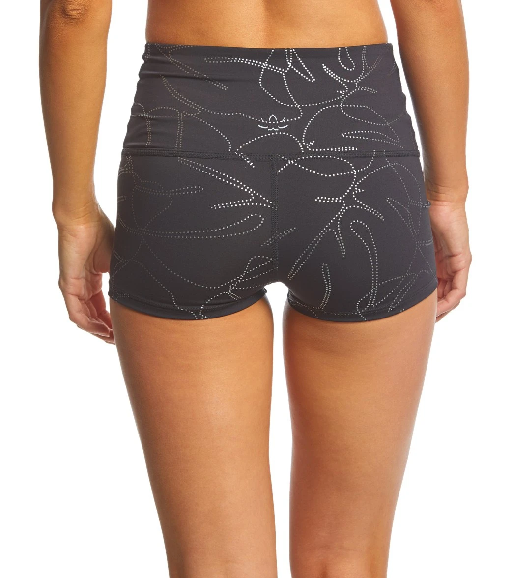 The limited edition Beyond Yoga Flashback Circuit High Waisted Short Shorts will keep you feeling and looking great. Shiny silver foil monstera leaves are printed all over, while a high waistband lined with Compression Lux fits snug at your natural waist.