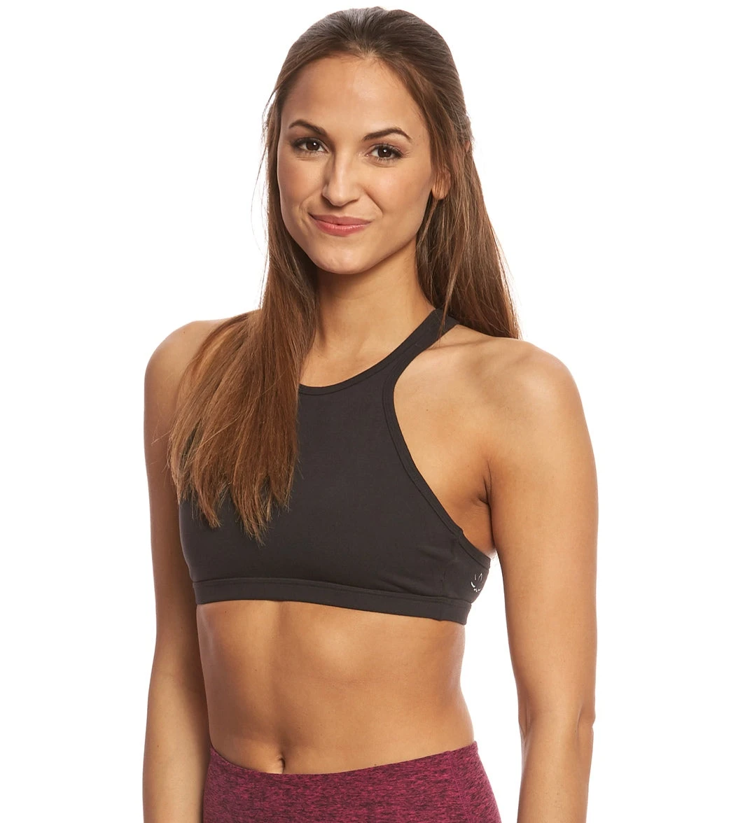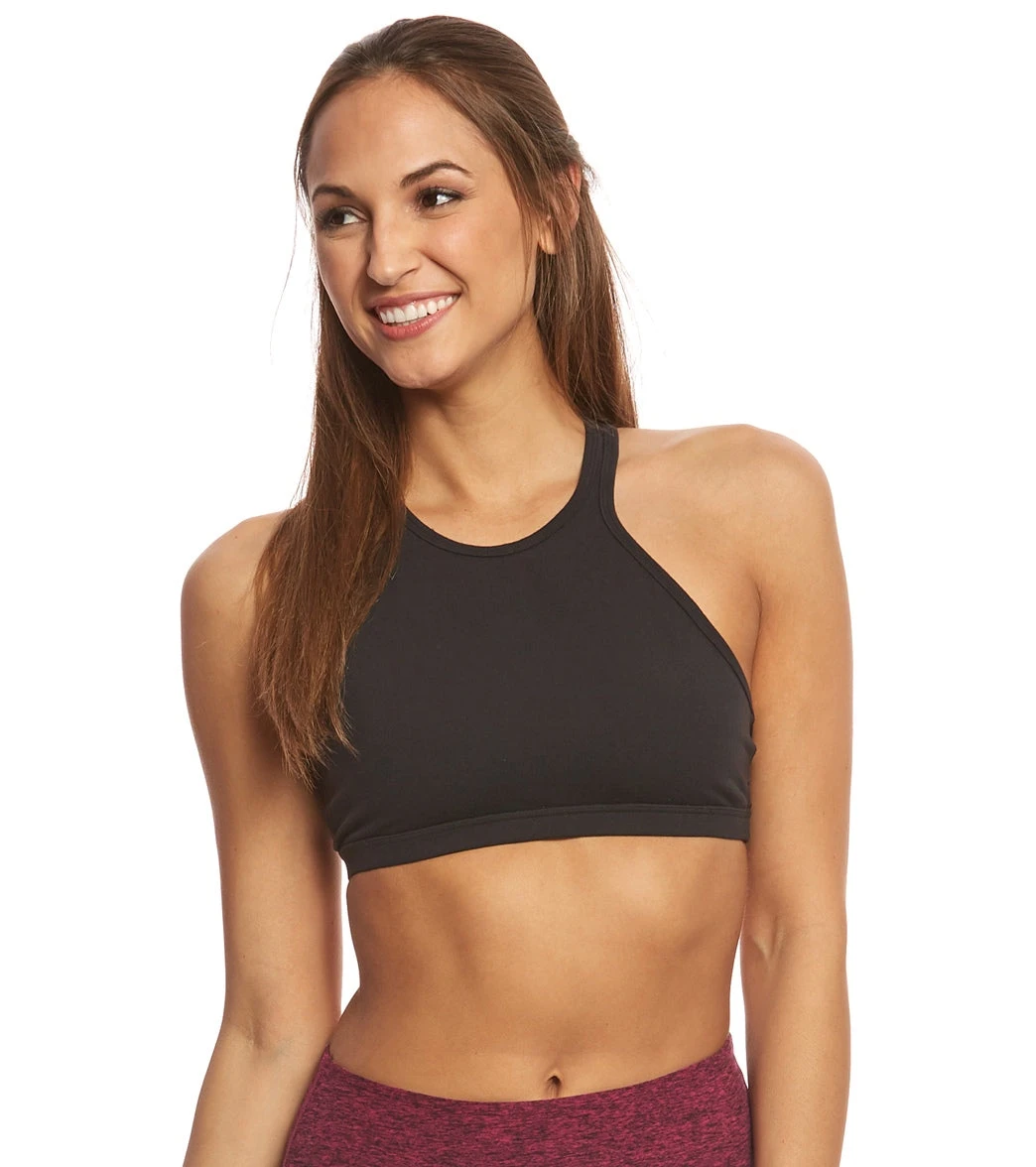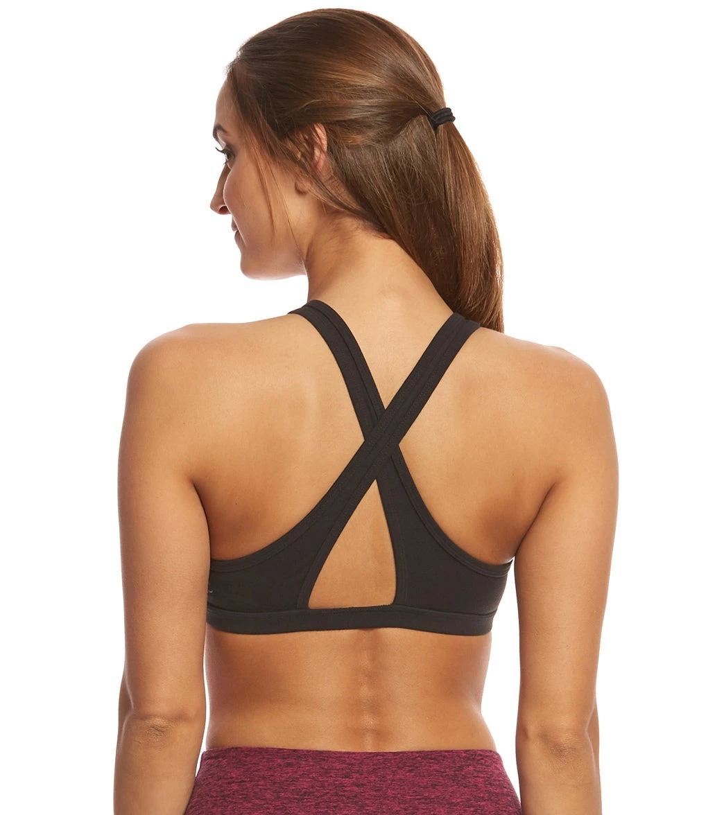 Update your studio staples with this Studio Yoga Sports Bra. A solid sports bra is updated with and on-trend high neckline and cutout, cross back design.
